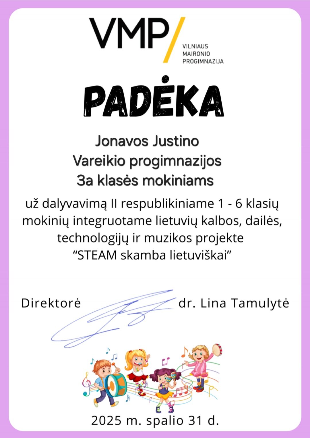 Jonavos Justino Vareikio progimnazijos 3a klasės mokiniai dalyvavo nuotoliniame II respublikiniame lietuvių kalbos, dailės, technologijų ir muzikos projekte „STEAM skamba lietuviškai“, kurį organizavo Vilniaus Maironio progimnazija.