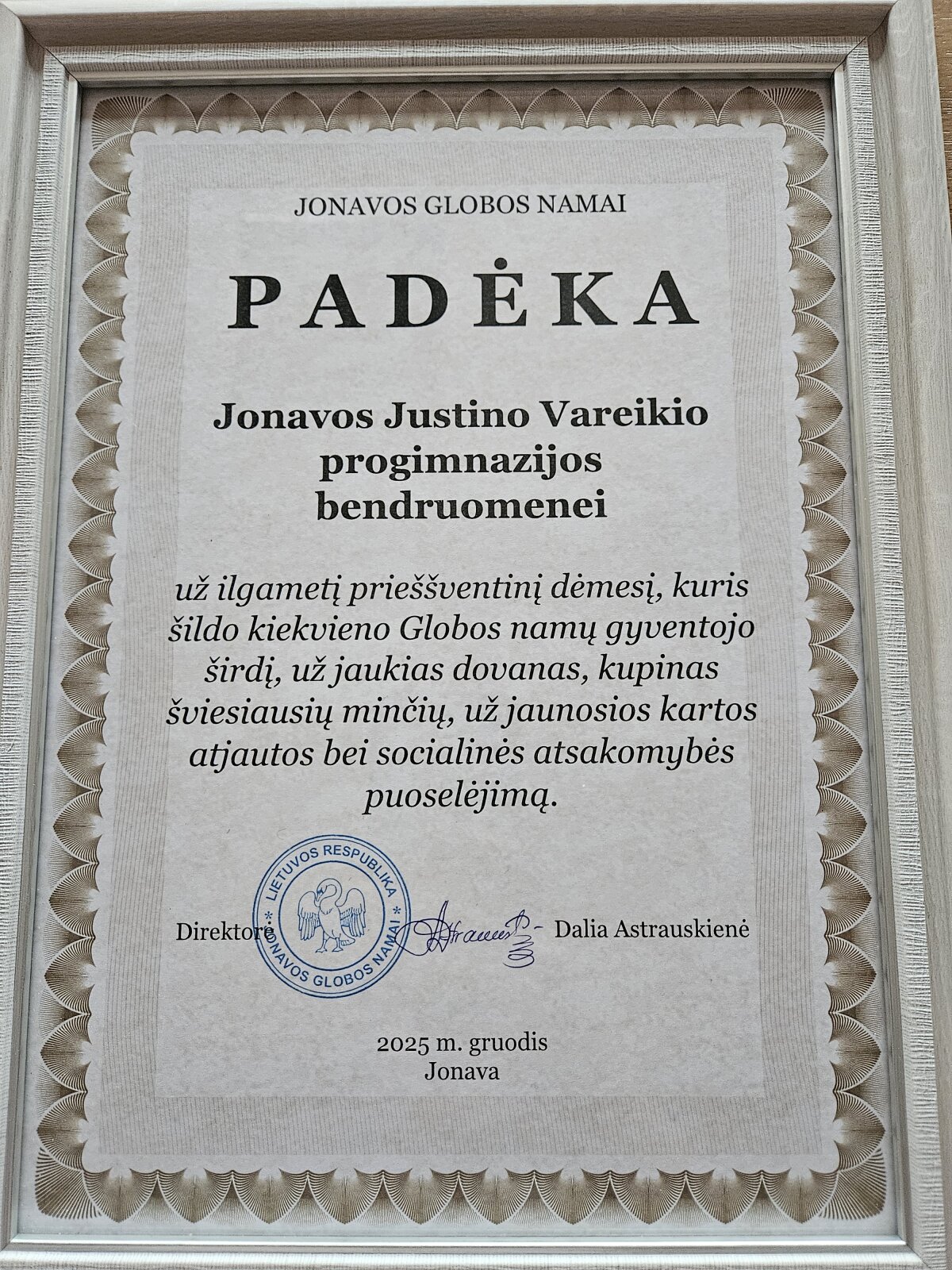 Jonavos Justino Vareikio progimnazijos bendruomenė jau daugelį metų puoselėja gražią ir šiltą tradiciją – socialinę iniciatyvą „Kalėdų šviesa“. Ši iniciatyva tapo neatsiejama progimnazijos vertybių dalimi, primenančia apie empatiją, pagarbą vyresniajai kartai ir nuoširdų norą dalytis gerumu.