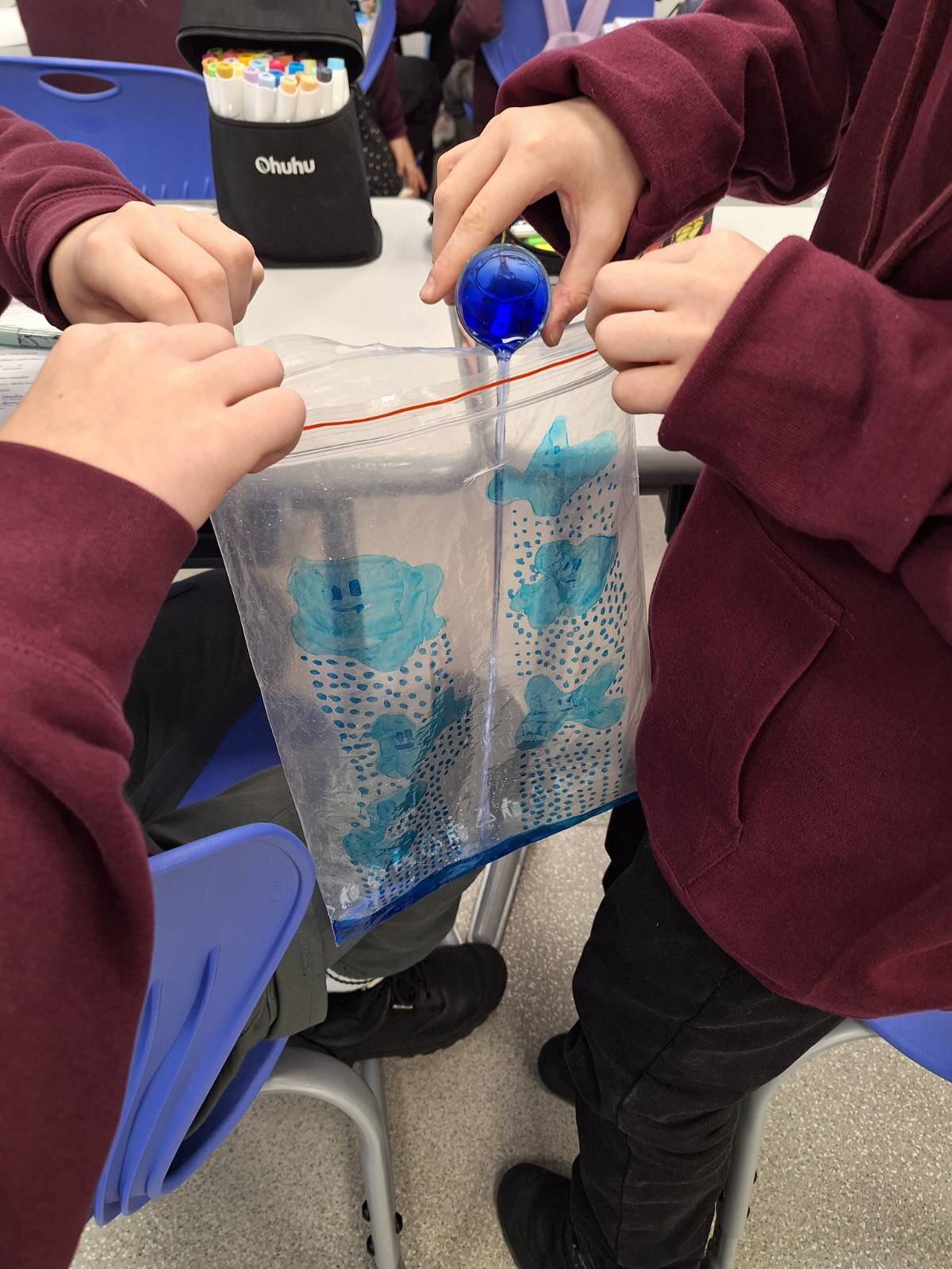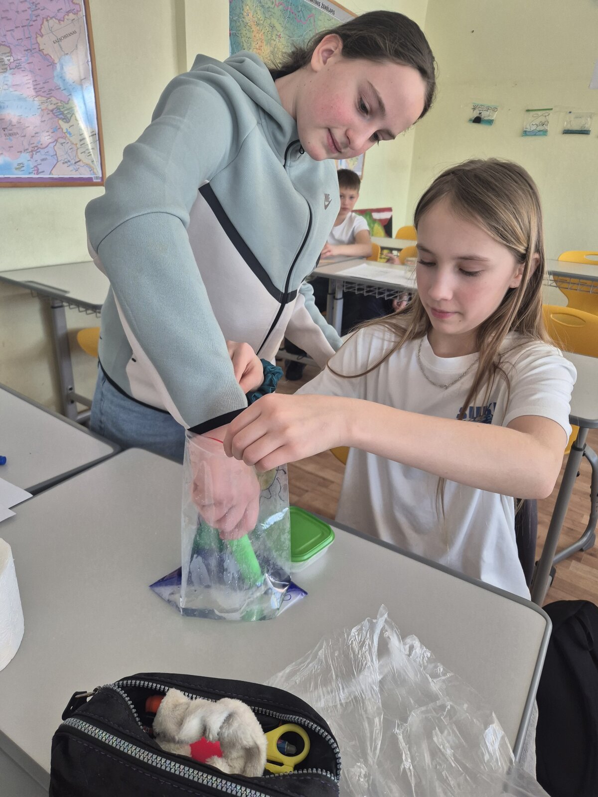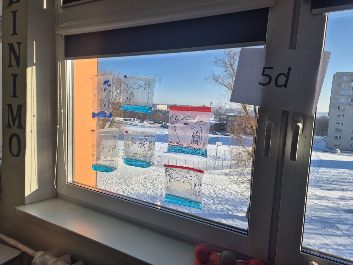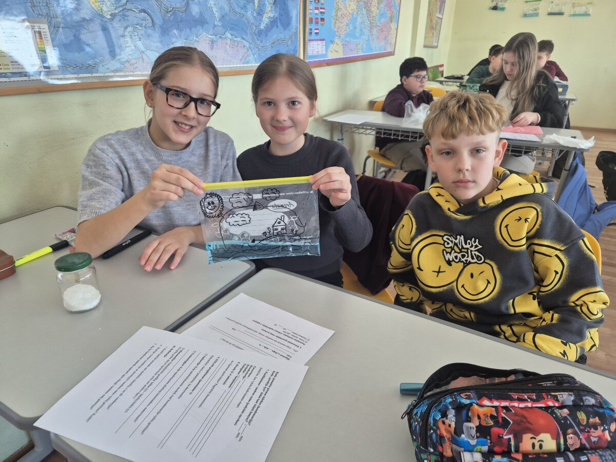 Pirmasis blynas tikrai neprisvilo – mokiniai aiškinosi vandens apytakos rato esmę. Jie ne tik stebėjo, bet ir patys patyrė, kaip vanduo, veikiamas skirtingų temperatūrų, garuoja, kondensuojasi ir virsta krituliais. Praktinė veikla padėjo suprasti reiškinius ne iš vadovėlio, o per realų patyrimą.