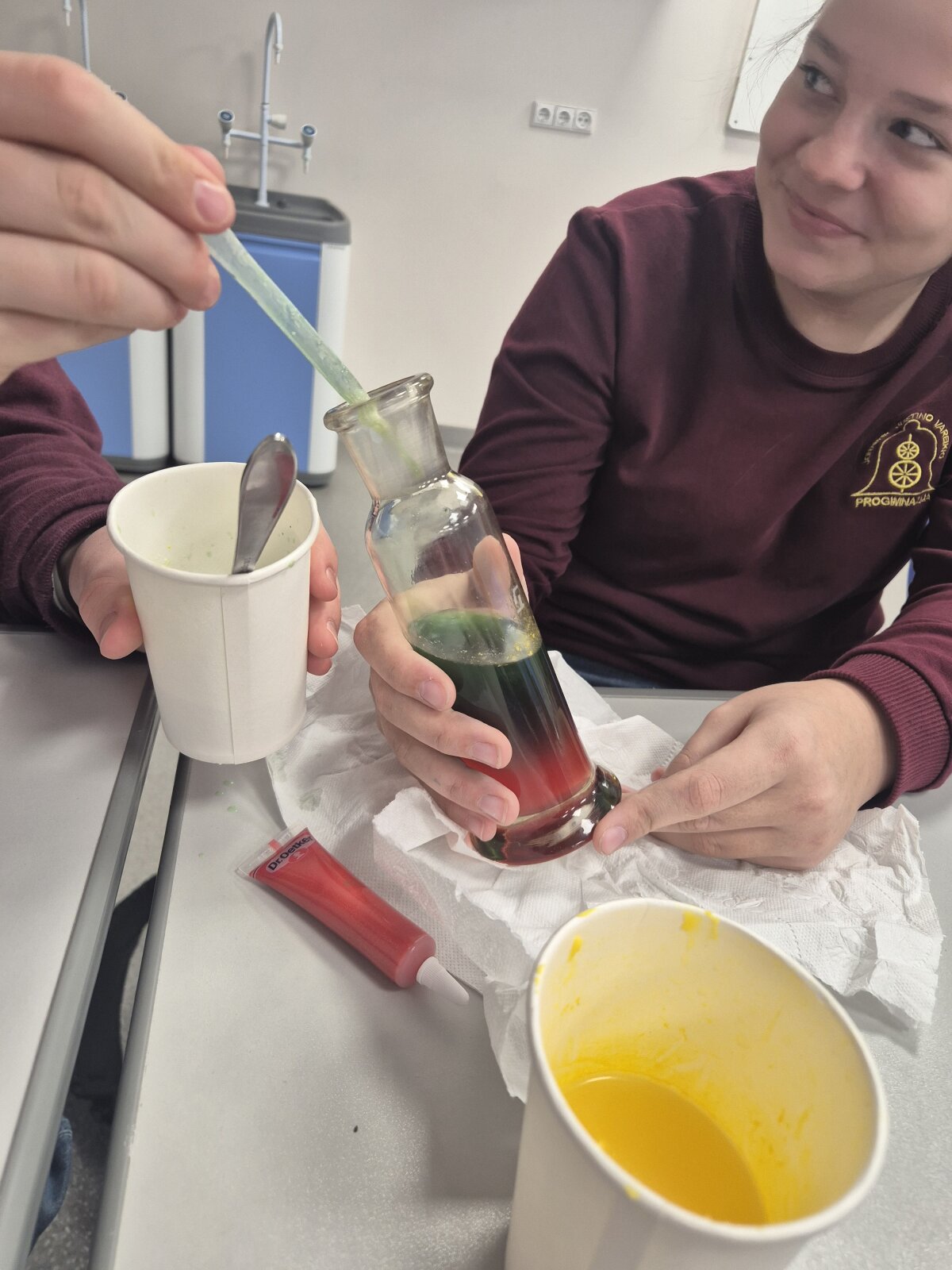 Pamoka tapo ne tik eksperimentu, bet ir pilietiškumo ugdymo akimirka – kalbėjome apie valstybės simbolių prasmę, pagarbą jiems ir apie tai, kodėl Vasario 16-oji laikoma viena svarbiausių Lietuvos švenčių. Mokiniai dirbo komandomis, laikėsi laboratorinio darbo taisyklių, atsakingai naudojo priemones ir įsitikino, kad mokslas gali padėti kūrybiškai pažinti savo šalį.