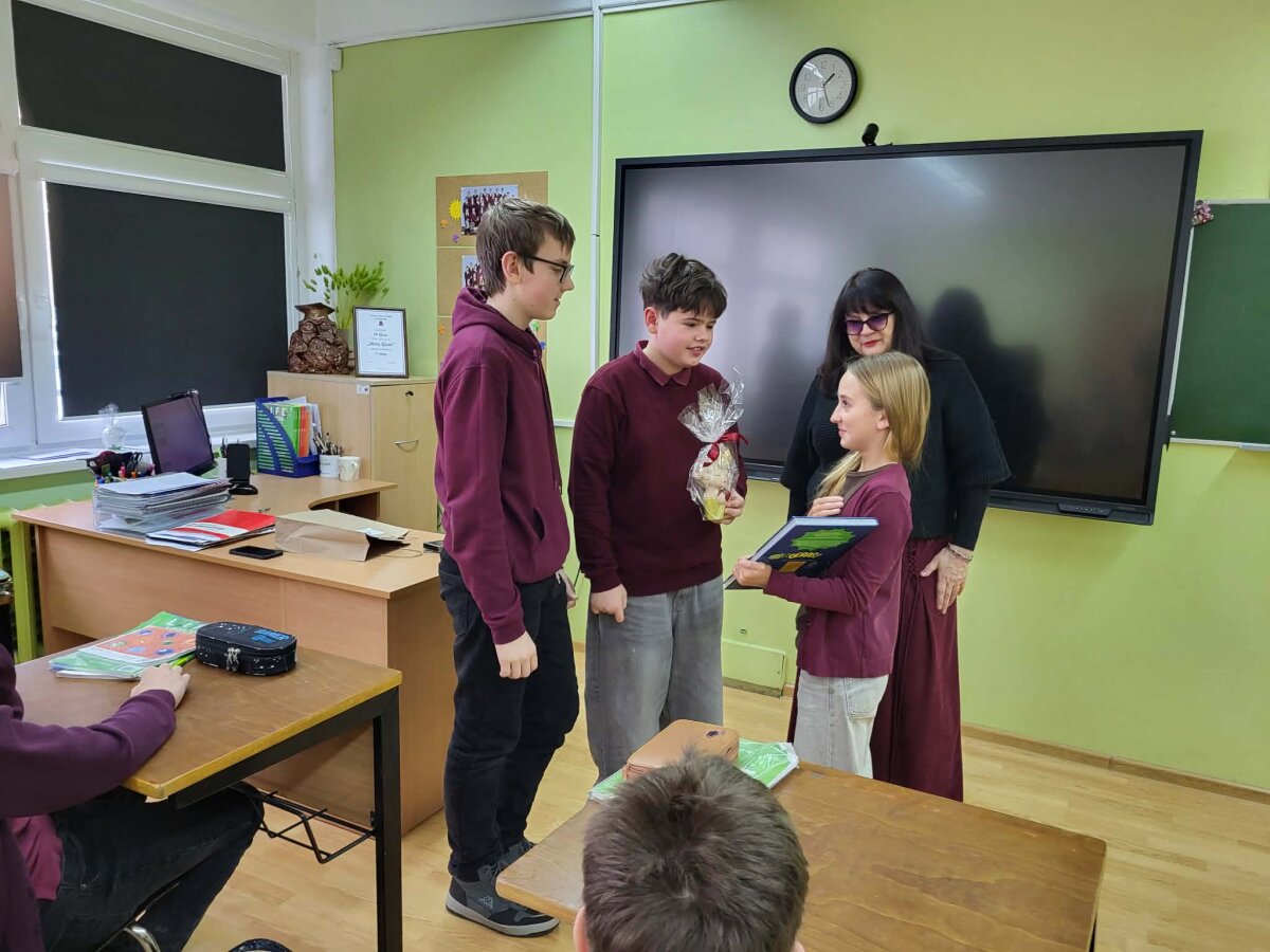 Mokyklos bendruomenė didžiuojasi Simonos ir Motiejaus įvertinimu. Mokinius pasveikino mokyklos direktorė, įteikė atminimo dovanėles, palinkėjo sėkmės, ištvermės, neprarasti ryžto bei siekti naujų pergalių. Klasės draugai, auklėtojos taip pat nuoširdžiais žodžiais ir palaikymu džiaugėsi jų pasiekimais.