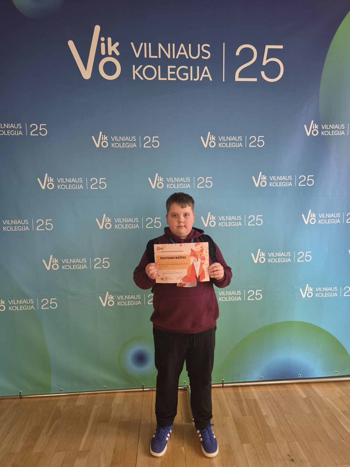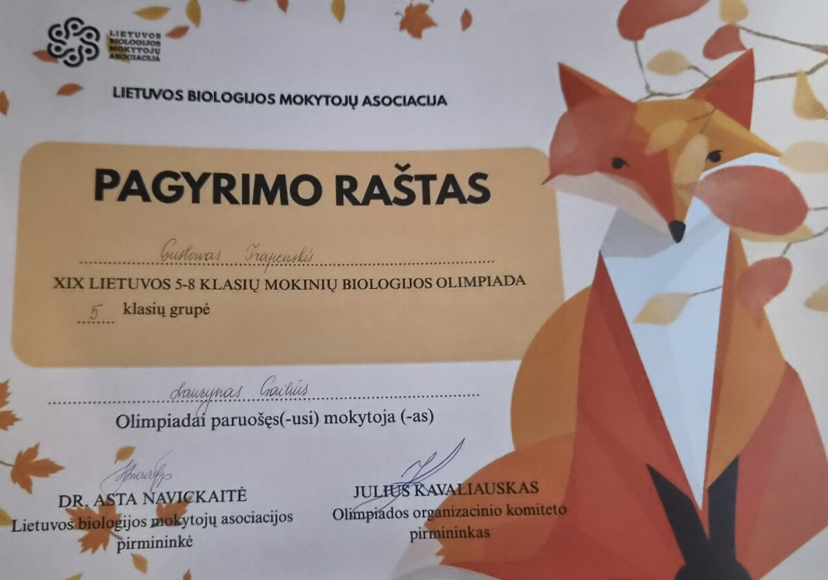 Džiaugiamės ir didžiuojamės, kad tarp stipriausių šalies mokinių buvo ir mūsų progimnazijos mokinys Gustavas Trapenskis. Po atkaklaus darbo, susikaupimo, ilgo užduočių sprendimo ir ne mažiau įtempto rezultatų laukimo Gustavas pelnė labai aukštą IV vietą. Tai puikus pasiekimas, rodantis jo žinias, smalsumą, atkaklumą ir nuoširdų domėjimąsi gamtos mokslais.