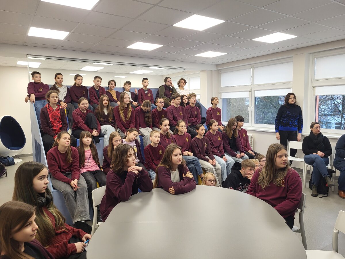 Kartu su progimnazijos vokiečių kalbos mokytojomis buvo organizuota bendra pamoka vokiečių kalbos besimokantiems mokiniams. Jos metu aštuntų klasių mokiniai viešnioms pristatė Jonavą, o mokytojos Karen ir Maja mokiniams papasakojo apie Vokietijos švietimo sistemą, savo mokyklą bei joje vykdomus tarptautinius projektus. Pamokos pabaigoje vyko aktyvi klausimų–atsakymų sesija.