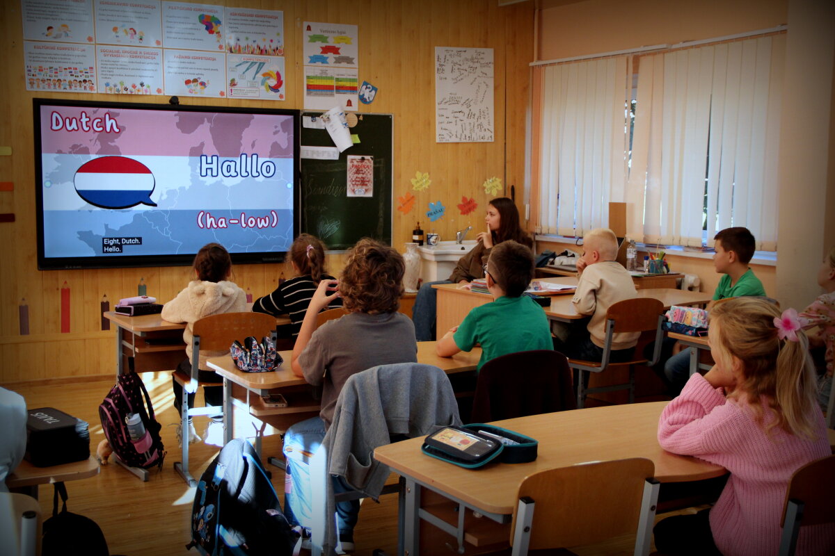 Ryte mokykloje visus pasitiko ant kabinetų durų užrašyti pasisveikinimo ir padėkos žodžiai įvairiomis Europos kalbomis. Įeidami į kabinetus mokiniai galėjo stabtelėti, pasidomėti ir išmokti naujų žodžių.