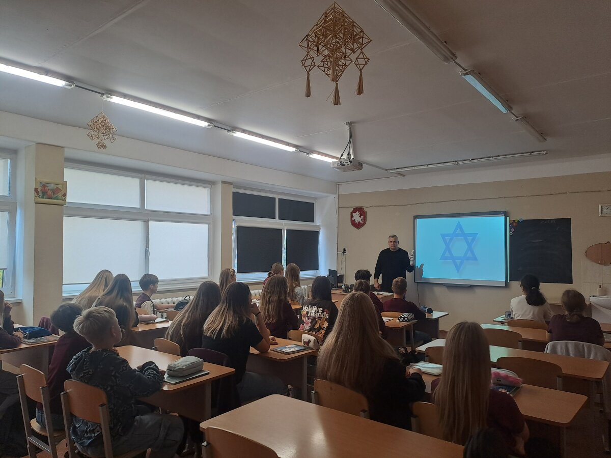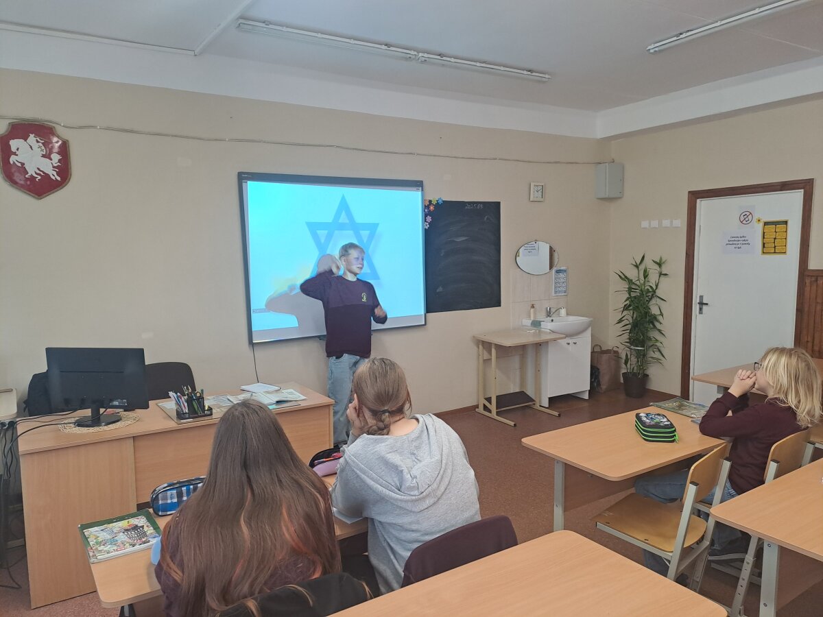 Su 5, 6, ir 7 klasių mokiniais buvo kalbama apie Holokaustą, Vilniaus getą, Jonavoje gyvenusių žydų likimą II pasaulinio karo metais. Pristatant istorinius faktus ir rodant skaidres, mokiniai aktyviai klausėsi, kėlė etinius klausimus ir dalijosi įžvalgomis, svarstė apie žmogaus teises, pagarbą ir atsakomybę už savo veiksmus.
