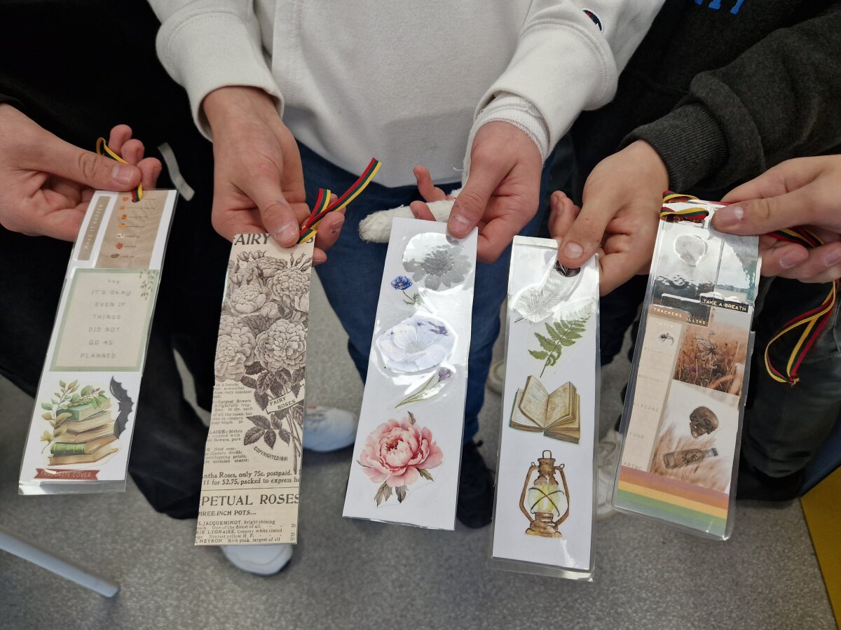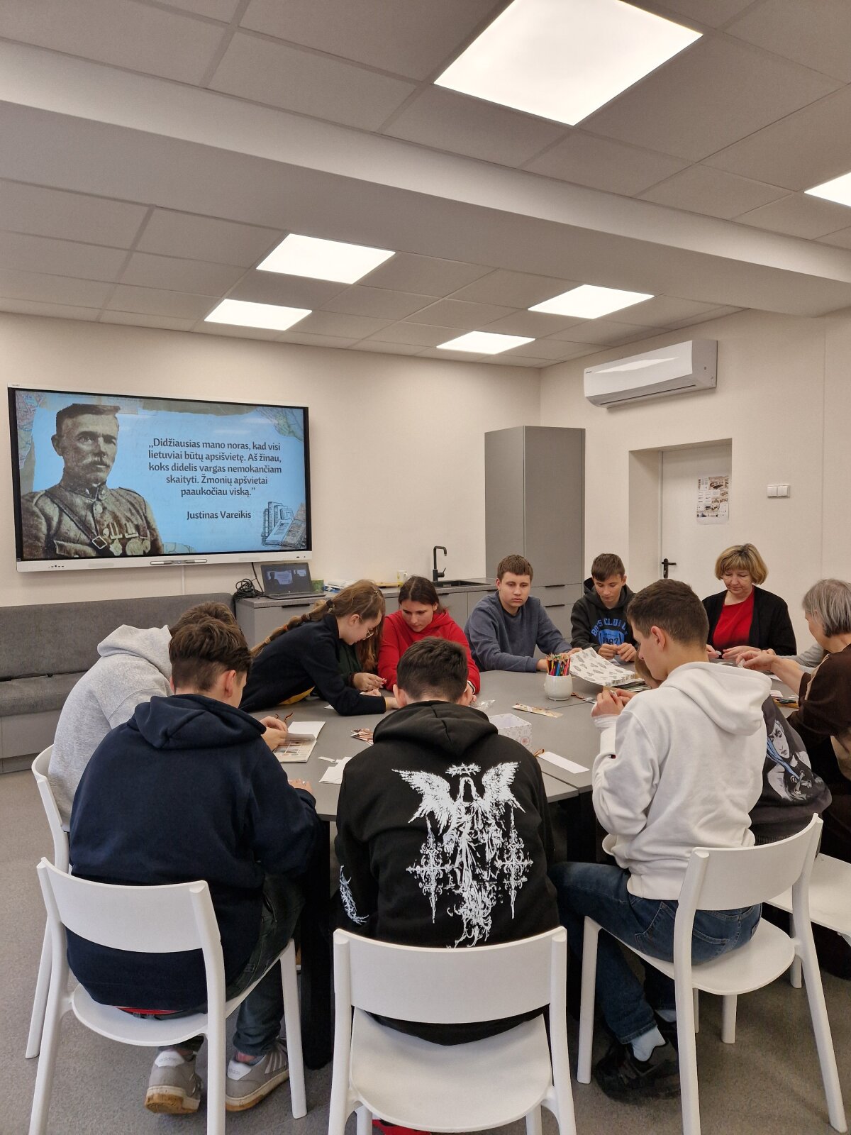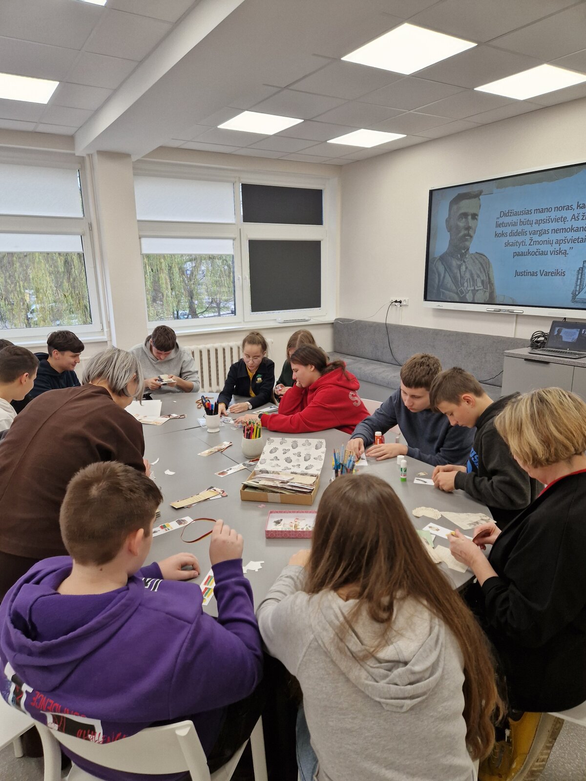 Lapkričio 21 d. mūsų progimnazijoje lankėsi Jonavos „Neries“ pagrindinės mokyklos mokiniai kartu su lietuvių kalbos mokytoja Daiva Balandiene. Svečiai susipažino su Justino Vareikio gyvenimo istorija, o po to pakvietėme juos į jaukias knygų skirtuko dirbtuves.
