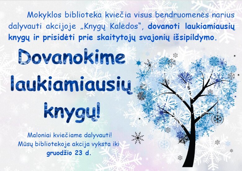 Mokyklos biblioteka kviečia visus bendruomenės narius dalyvauti akcijoje „Knygų Kalėdos“.
