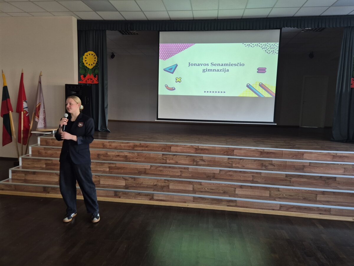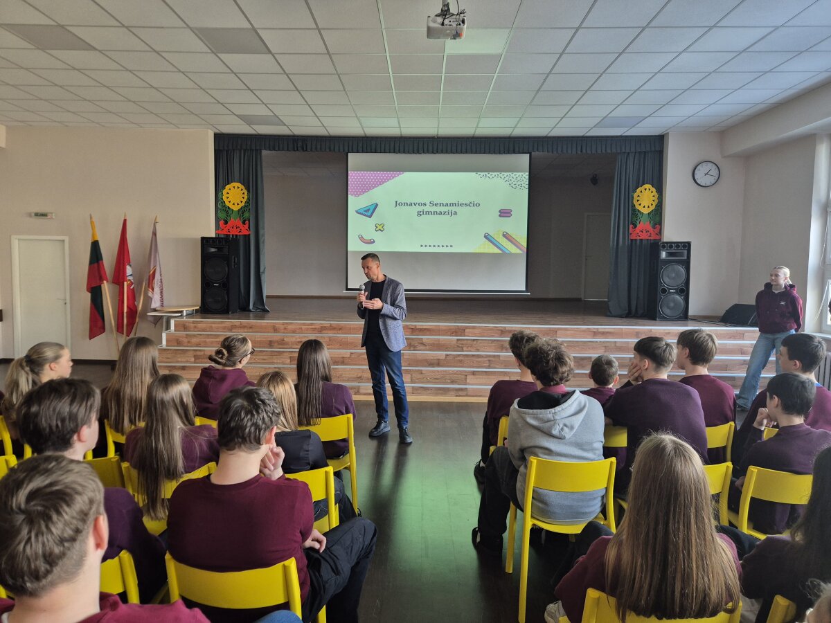 Aštuntos klasės mokiniai susitiko su Jonavos Senamiesčio gimnazijos direktoriumi Dariumi Mockumi ir gimnazijos mokiniais, kurie pristatė gimnaziją bei jos kasdienybę.