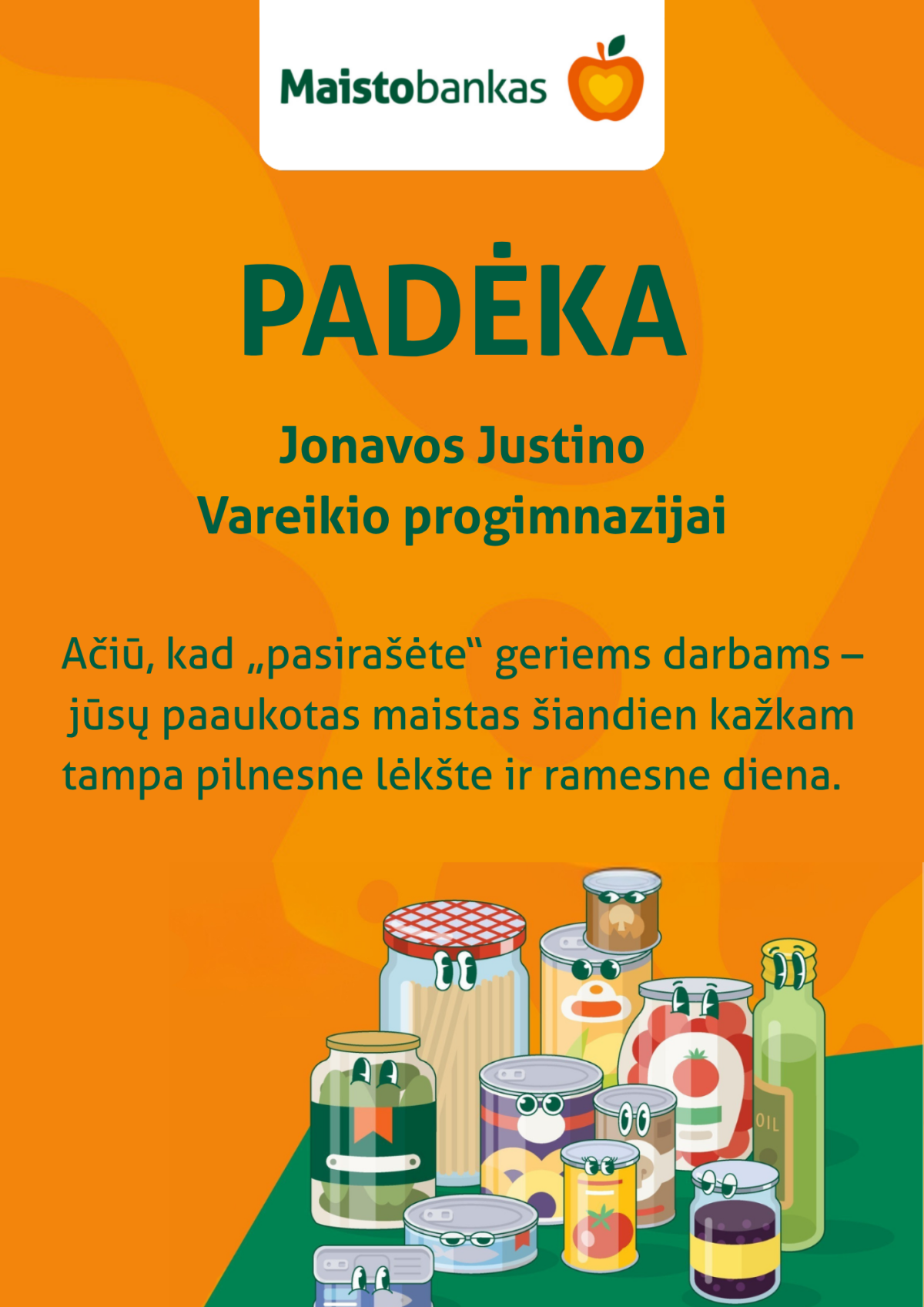 Kovo mėnesį Jonavos Justino Vareikio progimnazija vykdė „Maisto banko“ akciją, kurios metu visa mokyklos bendruomenė buvo kviečiama prisidėti prie pagalbos stokojantiems.